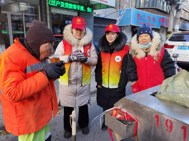 新如皋报讯 近日,如皋最低气温达到-10℃,室外呵气成霜。如城街道城南社区携手如皋市绿叶义工给辖区环卫工人送上自制的姜茶,驱走寒冷。