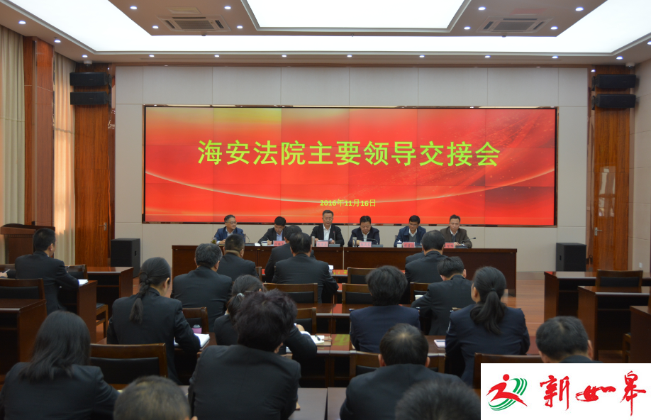 11月16日,海安法院主要负责人交接仪式在该院十三楼会议室举行。市中院党组书记、院长陈荣庆,海安县委书记陆卫东,海安县委常委、组织部部长陈鹏军,市中院党组成员、政治部主任刘碧波出席会议。会议由陈鹏军部长主持。