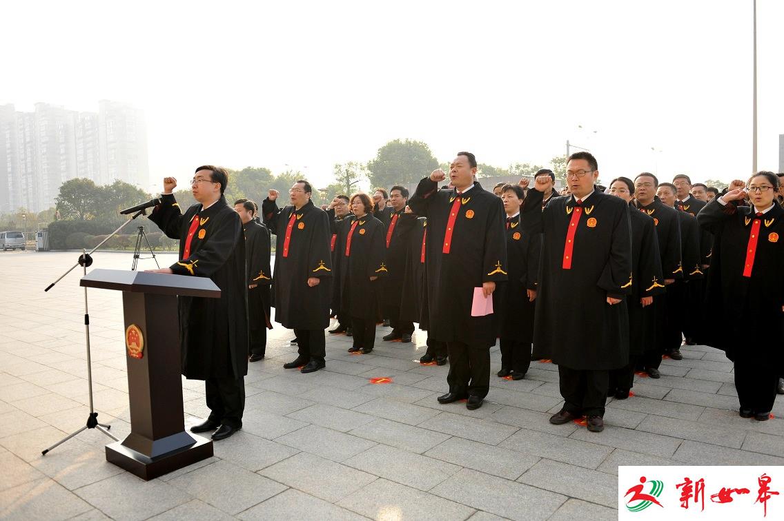 “我宣誓,忠于中华人民共和国宪法,维护宪法权威,……”12月4日上午,在“全国宪法日”当天,大丰法院按照上级法院统一部署,举行首批员额法官宣誓仪式。该院首批49名员额法官在党组书记、院长朱亮的领誓下,身着法袍,面向国旗,举起右拳,在该院广场举行了神圣而又庄严的宣誓仪式。图为该院员额法官向宪法宣誓现场。 (曹金晶)