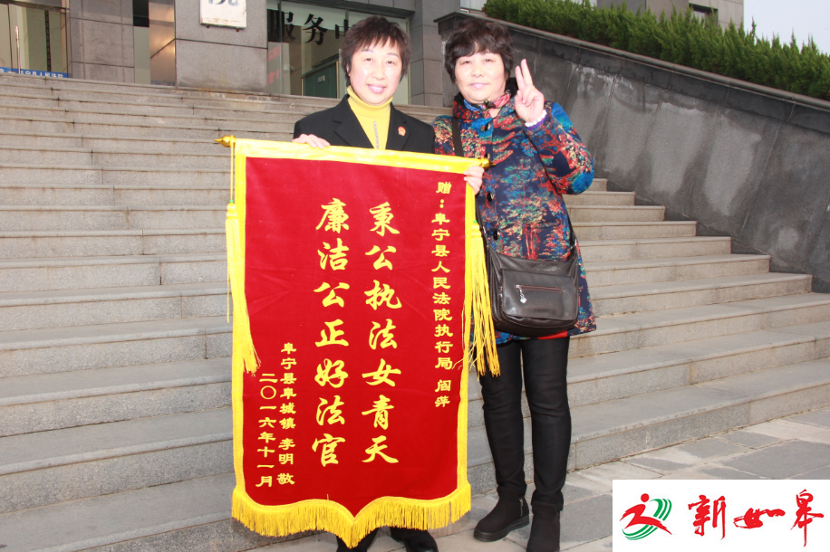 12月1日下午,李某将一面裱有“秉公执法女青天,廉洁公正好法官”的锦旗送至法院,对该案承办人执行局局长阎萍在执行过程中公正执法,倾心执行表达感谢。