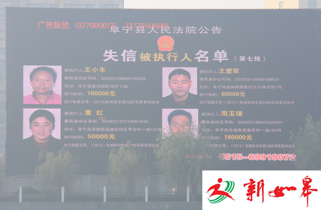 为大力破解执行难题,依法保护当事人的合法权益,加大对被执行人的信用惩戒,引导诚实守信的社会风尚,促使被执行人依法履行人民法院生效法律文书确定的义务。2016年12月1日,阜宁法院在县城闹市区电子广告显示屏、县内主要媒体曝光第七批“老赖”32人,让广大市民参与到监督的行列中来。(殷芹 丁亚平)