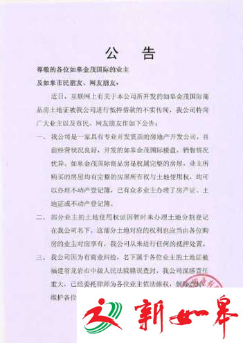 针对此事,金茂国际开发商作出了如下回应:近日,互联网上有关于本公司所开发的如皋金茂国际商品房土地证被公司进行抵押借款是不实传闻,业主所购买的房屋均有完整的土地所有权与土地使用权,均可以办理不动产登记。