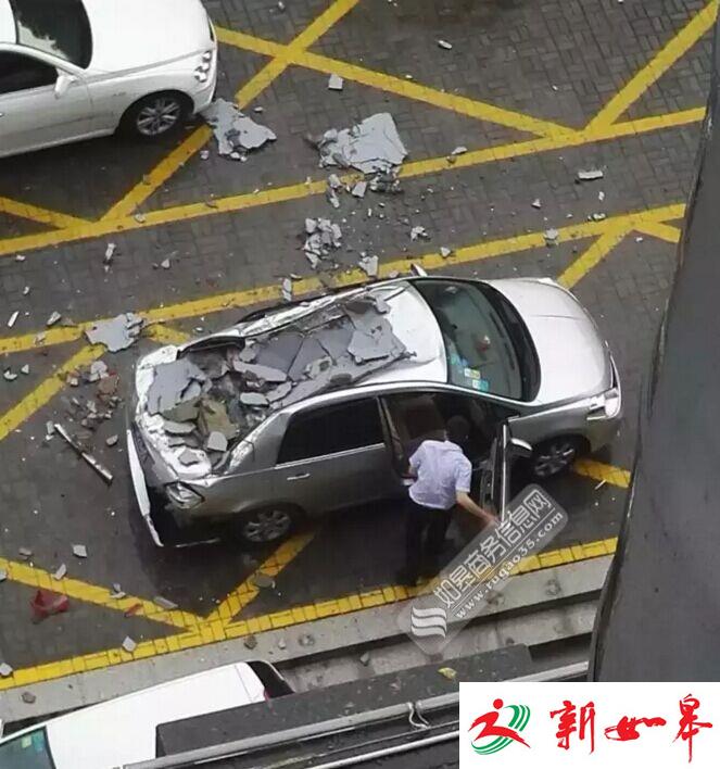 新如皋消息: 据如皋网友爆料,7月16日下午,如皋市大剧院旁的一小区外墙墙体材料脱落,砸中楼下停放的一辆汽车,所幸并未造成人员伤亡。