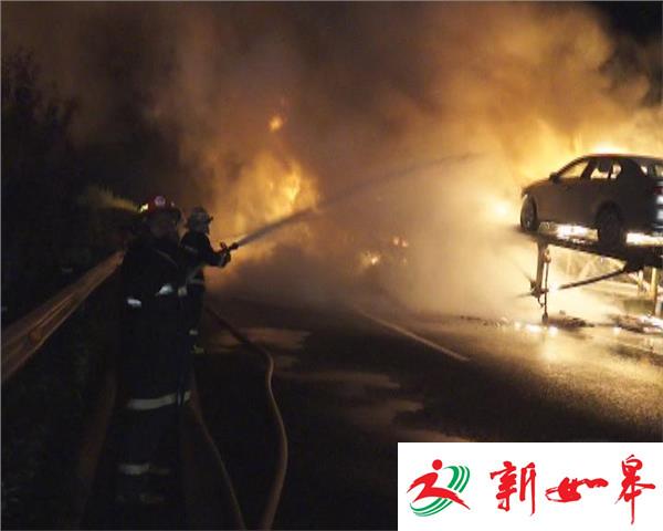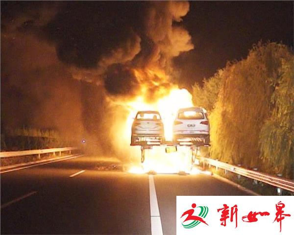 昨天(9月7日)凌晨3点54分,宿迁辖区新扬高速徐州往南京方向,距骆马湖服务区2公里处,一辆满载18辆汽车的半挂货车发生自燃。宿迁市公安消防支队宿新路中队接到报警后立即出动4辆消防车到场处置。到场时火势处于猛烈燃烧阶段,经过消防官兵奋力扑救,4点45分火势得到基本控制,5点10分火势被完全扑灭。