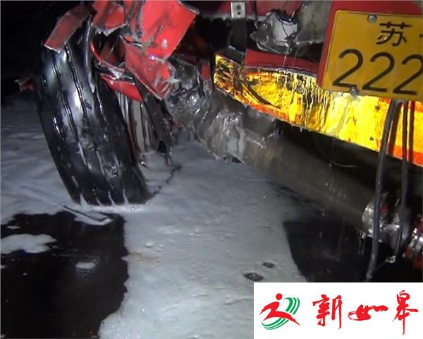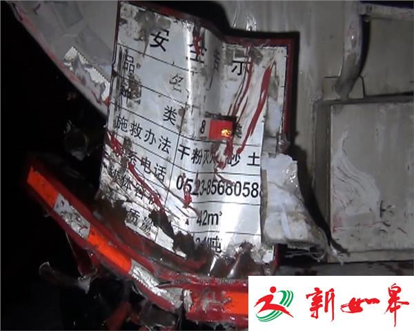 两辆危化品槽罐车停在路上,前车尾部变形严重,阀门因冲击损坏打开,罐内液体不断向外泄漏。消防队员赶到,勘察现场,喷泡沫稀释。据被撞的泰州牌照槽罐车司机介绍,他从山东枣庄开往泰州,罐内装载30吨,泄漏的是易燃液体醋酸丁酯,蒸气能与空气形成爆炸性混合物,有毒,已经泄漏了一吨多,十分危险。