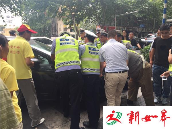 小车“吃掉”水泥球 交警、市民合力帮解围