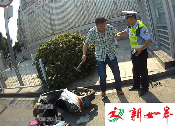 男子骑无牌摩托被查 竟然当街抡锤砸车