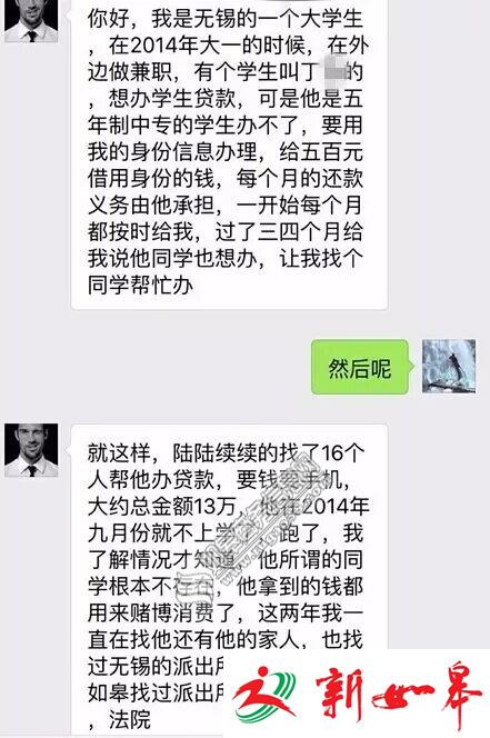 新如皋消息: 近日,有一位无锡网友爆料,称他是无锡交通高等职业技术学校一名学生,在学校有一位如皋籍同学丁某,用16名在校大学生的身份信息,通过大学生黄某向平台借贷约13万元,随后便失去了联系。而这些债款现在只能由同学们自己承担。希望能通过媒体帮帮他。