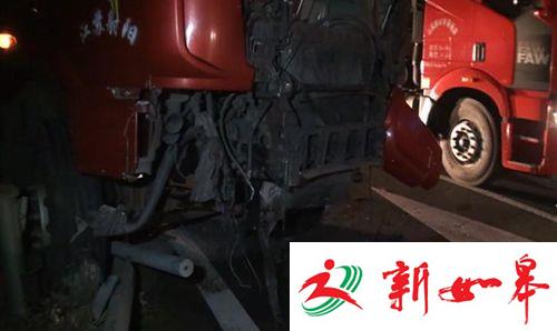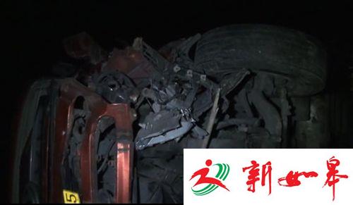 记者赶到现场时,受伤的电瓶三轮车驾驶员已被120救护车接送到医院抢救,事故处理民警封闭了由北向南的整个车道,采取借道的措施疏散积压车辆。一辆装运水产品的货车头朝南骑在路中央的隔离护栏上,车头占据了由南向北的半个车道,前保险杠脱落,塑料挡板破碎,几米隔离护栏因受到撞击而弯曲变形,车厢尾部的挡板被撕开,塑料周转箱损坏,一辆装运煤炭的货车侧翻在路边的草丛中,车头部位已经面目全非,保险杠和前挡风玻璃脱落,路边的多棵大树被连根拔起,压在车厢的下面,车厢左侧挡板高高翘起,车上装载的煤炭倾倒在路面上,占据了由北向南的三股车道,在南侧大约四、五十米远的车道里,一辆摩托三轮车侧翻在那里,机油、汽油泄漏一地。装运水产品的货车驾驶员告诉记者,他在正常行驶过程中,发现前方岔道口有一辆摩托车三轮车出来,便急忙采取了向左侧打方向并紧急刹车避让措施,谁知道刚将车子停下来,后面这辆装运煤炭的货车就追尾撞上来,将他的车子撞成现在这个样子了。装运煤炭的货车驾驶员告诉记者,看到前面车辆突然刹车,出于保护自己的本能,他也采取了打方向的避让措施,但有没有撞到摩托三轮车,他自己也不知道。