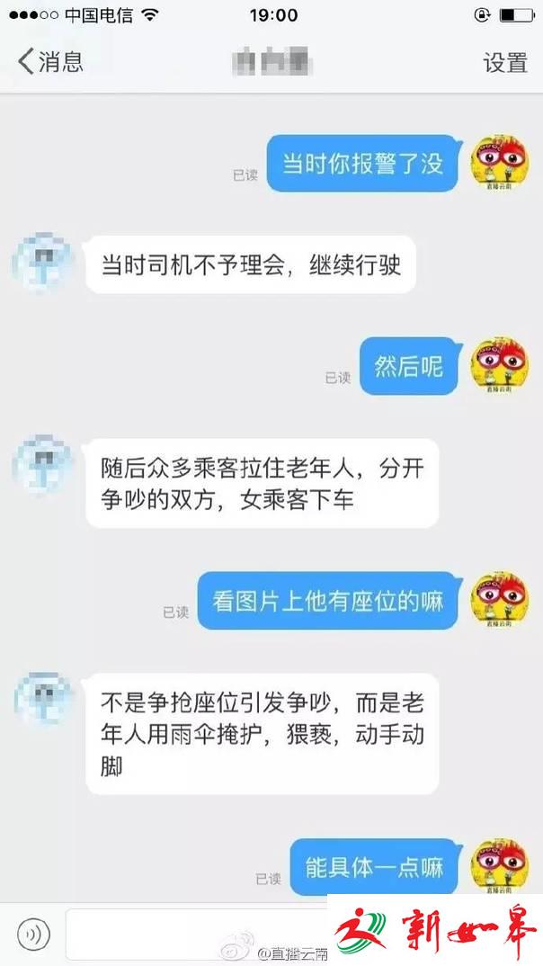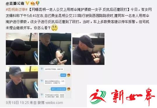 @直播云南 #昆明身边事# 【网曝昆明一老人公交上用雨伞掩护猥亵一女子 反抗后还遭殴打】今日,有女网友爆料称下午5点40左右,自己乘坐昆明公交233路行驶到西园路路段时,遭同车一名老人用雨伞掩护进行猥亵,该女子进行反抗后还遭到了殴打。当时,车上多数乘客建议停车报警,但司机未理会继续开车。你怎么看?