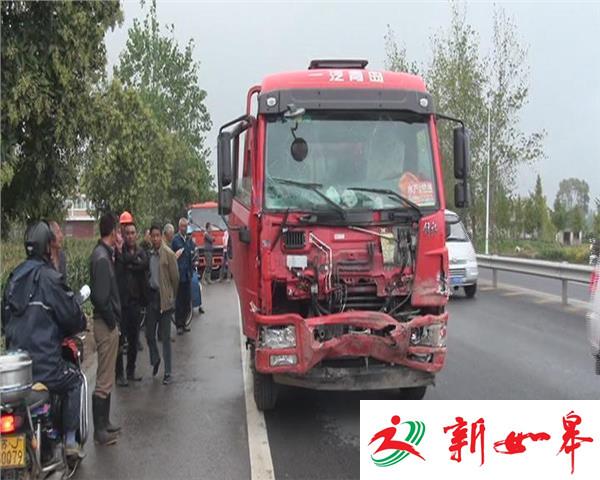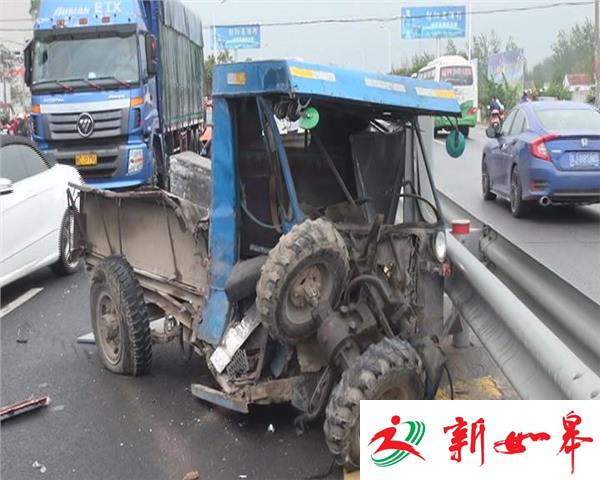记者赶到现场时,该路段已经被由北向南车道已经封闭,所有车辆被分流到对面车道借道行驶。一名中年男子仰面躺在路边的水泥场地上,地面上有一大滩血迹,已经没有了生命迹象,多名家人因无法接受眼这个事实,瘫坐在地上痛哭。在男子北侧的场地,一台拖拉机头抛在那里,路边的一根路灯杆和控制箱被连根拔起,电线裸露在外,路灯杆被抛在南侧十多米远的路边,在道路的中央,拖拉机机身与路灯控制箱和隔离护栏咬在一起,驾驶室严重变形,下面的角钢断裂,车厢右后轮胎爆胎,南侧大约七、八十米的路边,一辆装运水产品的货车停在行车道上,车前保险杠脱落,挡板弯曲变形,前挡风玻璃破碎。据货车驾驶员讲,他的车子是由北向南的,拖拉机是由南向北左拐弯朝西的,他在距离路口五十米左右的地方,发现左拐弯的拖拉机时,就采取了刹车避让措施,但由于雨天路滑,刹车根本就不起作用,结果就撞了上去。一位目睹事故发生的村民告诉记者,发生事故时,货车的速度很快,拖拉机已经快要通过路口了,货车撞上拖拉机,在把驾驶员从驾驶室内抛出后,货车推着拖拉机又将路边的路灯杆和控制箱撞坏,然后又把拖拉机撞到路中央的隔离护栏,自己向前又滑行了近百米才停了下来。
