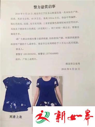 随后南京警方发布悬赏启事:2016年9月24日,南京市江宁东山街道发现一具未知名尸体。经查,死者为女性,40岁左右,身高165cm左右,体态中等,棕红色短发,纹眉,双耳有耳洞,上身穿蓝紫色圆领短袖双层雪纺衫,双袖及下摆有白色绣花(详见照片),死亡时间一周左右,曾做过阑尾手术。请广大群众积极向警方提供线索,协助查找尸源。对提供线索协助查明尸源的个人或单位,南京公安将给予3万元人民币奖励。联系人曹警官18913833255,杨警官13776548885。