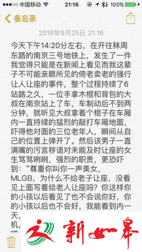 “@桃纸的围脖”告诉现代快报记者,9月25日下午2点20分左右,在地铁3号线上,大概是在新庄站,上来一位大叔。见没人让座,就对着一名年轻女孩开骂起来,还不停地用棍子敲击车底,吓得女孩旁边三人都跳了起来,纷纷让出座位。