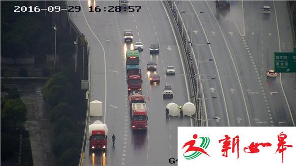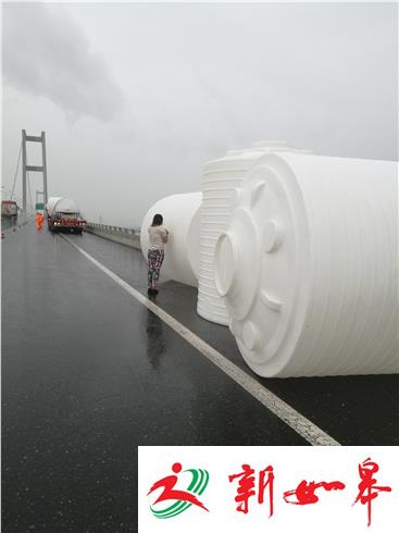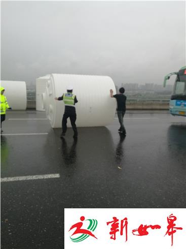 2016年9月29日傍晚,一辆河北号牌的半挂货车行驶到扬溧高速润扬大桥上时突然掉落3个巨型蓄水桶,顿时占用了一、二行车道,幸亏镇江交警高速二大队执勤民警巡逻发现后迅速处置,冒雨协助施救人员将货物重新装载,消除了安全隐患,司机得以安全前往目的地。