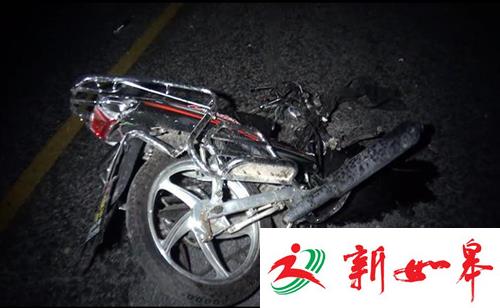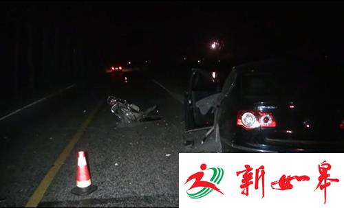 10月10日晚上8点钟左右,在射阳盐场达阳公司门前的海堤公路上,一辆由南向北快速行驶的轿车疑因避让不及,与一辆由北向南的摩托车发生剧烈的碰撞后,整个车子旋转了一百八十度,又与路边的桥护栏发生碰撞,事故导致摩托车驾驶员当场身亡,摩托车报废。