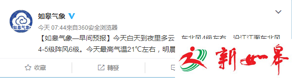 10日7时44分,如皋气象台通过官方微博发布消息:今天白天到夜里多云。东北风4级左右,沿江江面东北风4-5级阵风6级。今天最高气温21℃左右,明晨最低气温14℃左右。