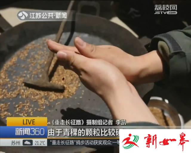 江苏台记者李凯说:“由于青稞的颗粒比较硬,刚刚搓完之后已经感觉手有一种明显的刺痛感,刚刚我只是搓了三把,可想而知当年红军搓了十几万斤的青稞,他们的手部会是怎么样的。”