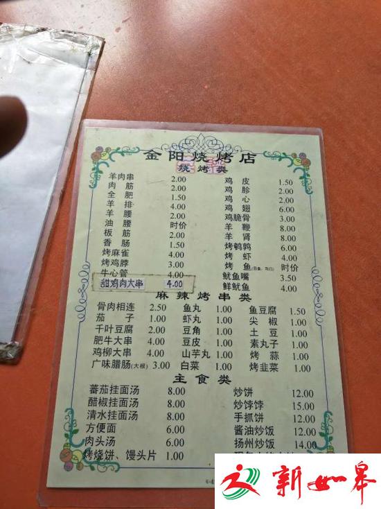 天津北辰区北仓镇政府附近,金阳烧烤总店的菜单上公然写有烤麻雀、烤鹌鹑。