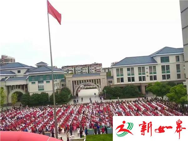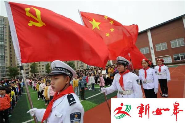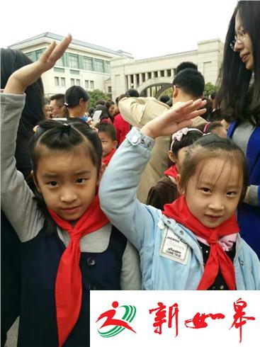 最后,全体少先队员举起右拳,跟着大队辅导员呼号,同学们铿锵有力的呼号声响彻校园上空。
