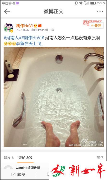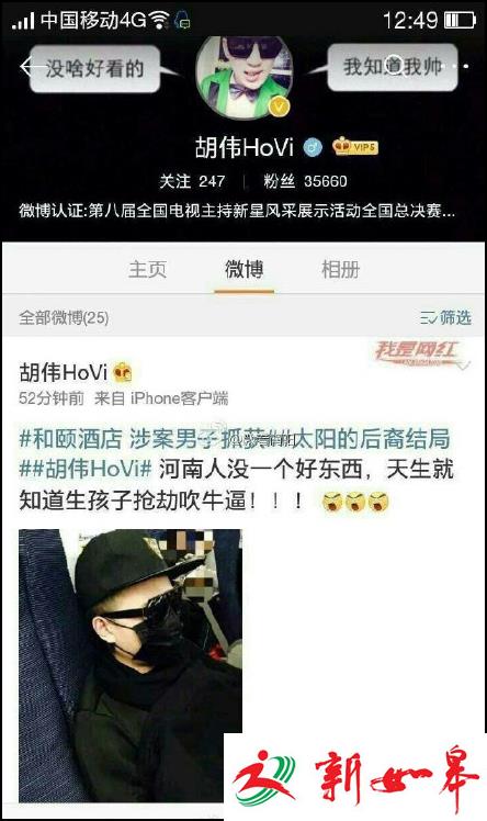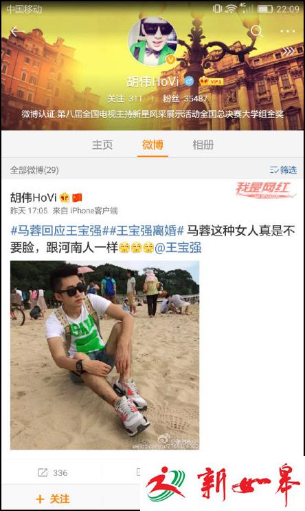 8月14日17点05分,自称“非著名主持人”的胡伟在其新浪微博中频频借助热点事件,对河南人进行语言攻击。在演员王宝强发布离婚声明,胡伟在微博中写道:“马某这种女人真是不要脸,跟河南人一样的不堪。”