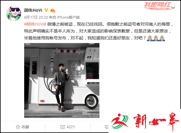 同日,胡伟还更新了另一条微博辩解称,“微博之前被盗,现在已经找回。很抱歉之前盗号者对河南人的侮辱,特此声明确实不是本人所为,对大家造成的影响深表歉意,但是还请大家原谅,毕竟他使用我帐号发布,对不起,我知道我们还是好朋友,对吧?”