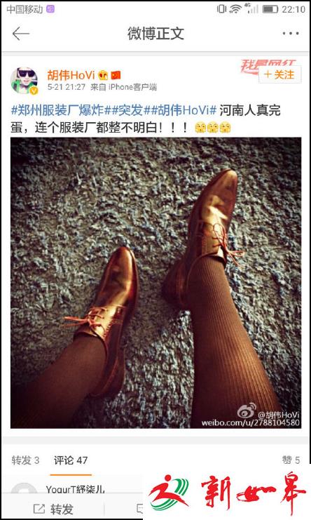 5月21日,河南省郑州市一服装厂突发爆炸事件,在所有人关注抢险救灾、关心受难者生命安全时,胡伟作为有一定影响力的公众人物,却在其新浪微博中写道:“河南人真完蛋”的言论。