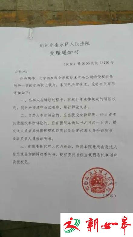 在这之后的8月31日,郑州市民井长水以个人名义,将胡伟及新浪微博注册的独立公司微梦创科网络技术有限公司作为被告,向郑州市金水区人民法院递交了民事起诉状,起诉状中要求胡伟删除并停止发表相关侮辱河南人名誉的言论,要求被告在国家及河南省主流媒体公开向河南人赔礼道歉、消除影响、恢复名誉,并要求二被告赔偿精神损害抚慰金1000元。