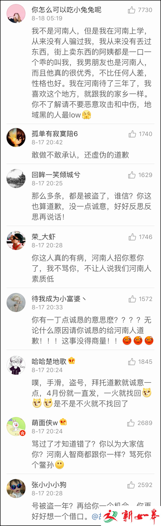 而到了第二天(8月17日)胡伟发布了一条微博称,“我还是个孩子,不想因为你们的事把我牵扯进去,河南人攻击我真的是太没素质了,我的生活受到了影响,我要用法律保护。”《郑州晚报》记者表示,这很显然是受不了大量网友的谴责和回击删除了14日发的“骂马某跟河南人一样不要脸”的微博后的回应。