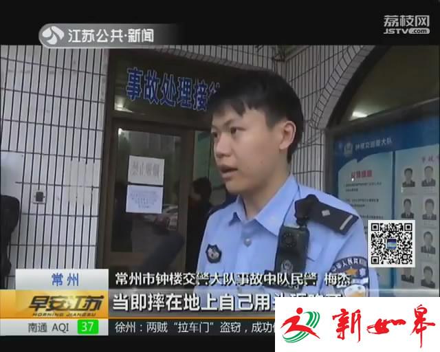 常州市钟楼交警大队事故中队民警梅杰表示,黄某很偏激,当即摔在路上自己用头砸路牙,我当时抱着他摔在路上,后来发现他有咬舌自尽的冲动,我就只能把手塞在他嘴里撑住他的嘴,手上这边伤还没好,就是怕他想不开。