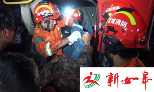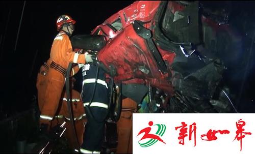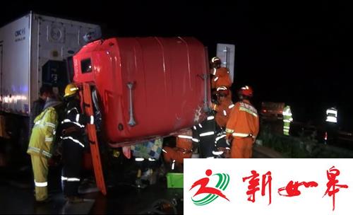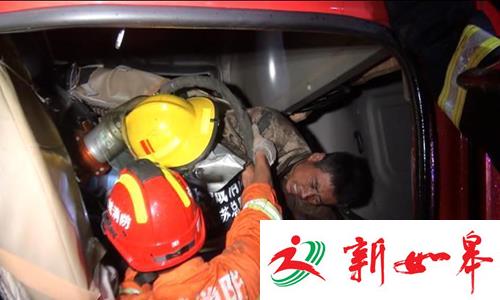 记者冒雨赶到事故现场时看到,消防官兵正在对厢式货车驾驶员进行救援,受伤的驾驶员神志清醒,一名身穿雨衣的中年男子仰面躺在由北向南的快车道里,不停地抽搐,几名亲属打着雨伞围在旁边,在由南向北的车道边上,一名男子头部受伤,流血不止。记者在现场看到,一辆二轮摩托车侧倒在由北向南的车道边上,塑料行李箱损坏,一辆大货车逆向停在由南向北的车道里,车头与车厢呈九十度,整个驾驶室变形脱落,被抛在十字路口的中央,一辆厢式货车头朝西北横停在十字路口北侧的车道里,占据了由南向北的三股车道,导致该路段同行中断,由南向北车辆大量积压,为确保救援消防官兵的安全,防止过往车辆发生二次事故,射阳警方随即指令临近的盐场、洋马两个派出所的警力增援,协助交警疏导、指挥由北向南方向的车辆缓慢通过事故路段。120救护车赶到现场后,迅速将摩托车驾驶员和大货车上两名驾乘人员接送到医院抢救。由于厢式货车受到严重的撞击,整个驾驶室前翻,变形的方向盘顶住驾驶员的下腹部,致使驾驶员无法动弹,由于空间狭小,给救援工作带来不小的难度,消防官兵动用大力剪、扩张器等工具,经过一个多小时的努力,才将被困的驾驶员成功救出变形的驾驶室。据摩托车驾驶员的亲属讲,摩托车是由北向南左拐弯朝东的,结果被后面的大货车给撞,而大货车在采取打方向紧急避让过程中,又冲到对面的车道里,与厢式货车发生了碰撞。另两名受伤较轻的男子告诉记者,他们分别是睡在两辆货车上的驾乘人员,事发时他们正在睡觉,也不知道是什么情况。