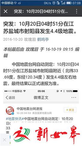 据中国地震台网自动测定报告,10月20日凌晨4点51分左右,在北纬33度69分、东经120度34分的盐城射阳县附近,发生了四点四级左右的有感地震。