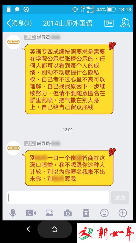 “英语专四成绩按照要求是需要在学院公示栏张榜公示的,任何人都可以看到每个人的成绩,别动不动就提什么隐私权。自己考不过心里不爽可以理解,自己找找原因下一步继续努力。但请不要随意匿名在群里乱喷,把气撒在别人身上,自己给自己留点底线。”不久后,杨森在名为“2014山师外国语”的另外一个QQ群里向学生发言。