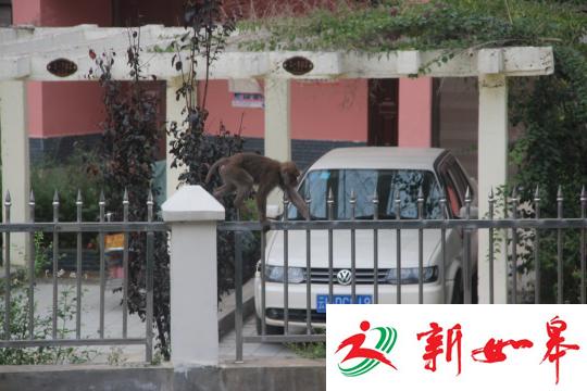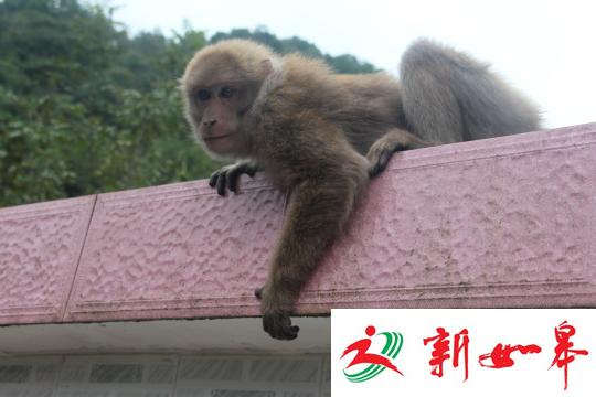 图为顽皮猕猴在居民区窜来窜去
