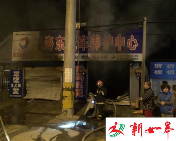 11月1日晚上11点50分左右,盐城市大丰区南翔路海东汽修厂突然浓烟滚滚,还不断发生扑扑的响声,附近的邻居听到响声出来一看吓了一跳,报警后,110、119迅速赶到现场对该厂的卷闸门进行破拆,消防员随后拿着水枪进去对着大火进行扑救。