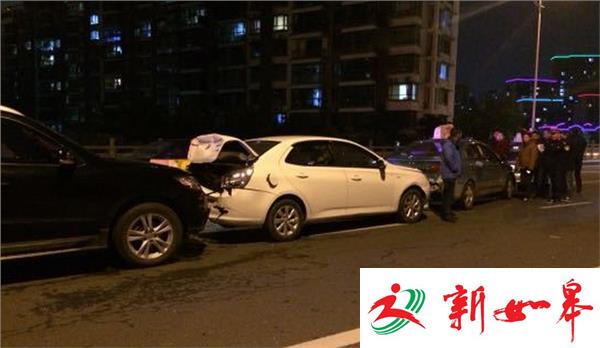 在现场可以看到,发生事故的路段出现了交通拥堵,连环追尾的四辆车还停留在原处,除了中间两辆车损毁较为严重之外,剩下的两辆车只是车尾部和保险杠有些变形。好在发生的桥段正在维修,所有通过的车辆车速都不快,所以事故没有造成人员伤亡。