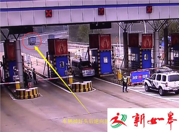 当日下午1点多,徐州高速七大队民警在京沪高速新沂东收费站执勤时,发现一辆正在排队交费的蓝色大货车突然调转车头,沿着匝道逆行回高速。