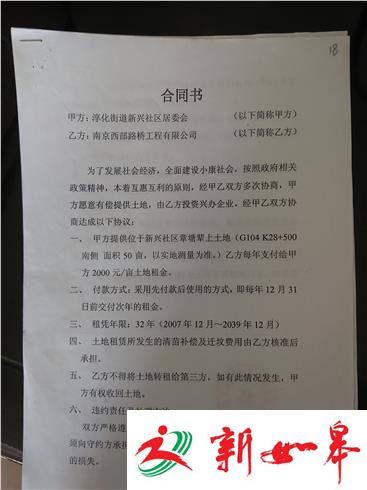 记者了解到,2007年西部路桥公司与淳化街道新兴社区居委会签订了一份合同,协议规定,甲方新兴社区向乙方西部路桥公司提供50亩土地,租赁年限为32年,同时乙方要在甲方注册纳税。江宁区淳化街道新兴社区负责人介绍,拌合场用地牵扯到基本农田,如果变更为建设用地会非常麻烦,当时只办理了临时手续两年,不过此后租赁合同并未停止执行。