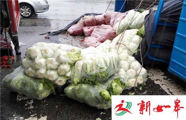 现场路面上正在进行驳运,侧翻货车占据了路口两股车道,通往事发现场路面上两辆施救车正在对来往车辆进行疏导分流,货车司机和家人正在对侧翻的蔬菜进行驳运到另一辆货车,现场看到货车上的蔬菜有红椒,大白菜和冬瓜等蔬菜。
