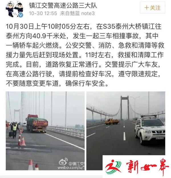 泰州长江大桥一车被撞后起火 事故致三死一伤