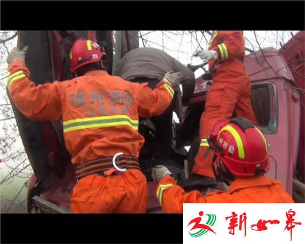 11月3日早上6时37分,徐州丰县赵庄公路上发生一起交通事故。一辆半挂车失控驶出公路撞到路旁树上,车内一人被困,情况危急,请求救援。接到报警后丰县消防中队迅速出动1车6人赶赴现场处置。