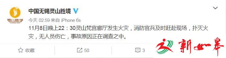 几个小时之后,无锡灵山胜境景区官微,在将近凌晨3点时发微博证实:“11月8日晚上22:30灵山梵宫廊厅发生火灾,消防官兵及时赶赴现场,扑灭火灾,无人员伤亡,事故原因正在调查之中。”