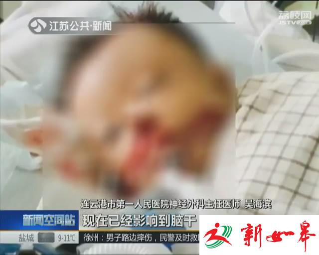 连云港市第一人民医院神经外科主任医师吴海琼介绍,一个重物砸到了脑后,首先使后面整骨就是老百姓说的后脑勺整骨骨折,然后整个力量传到了脑干把小孩砸到地上,使他前面的颅骨又出现了骨折血肿,所以说是双重的打击,现在已经影响到脑干管的呼吸和心跳的地方。