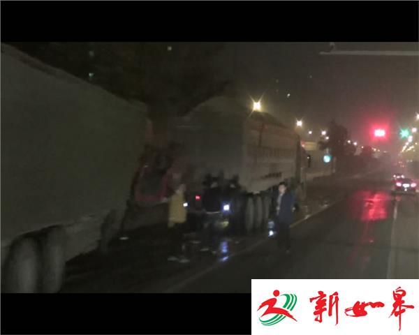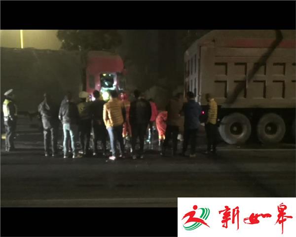 11月13日晚上23时50分,徐州经济开发区城置花园西门长安大道红绿灯处发生一起交通事故,一辆满载水泥的自卸王追尾一辆满载石子的自卸王,水泥车上有一名副驾人员被困,徐州消防特勤二中队立即出动2车12人前往现场进行救援。