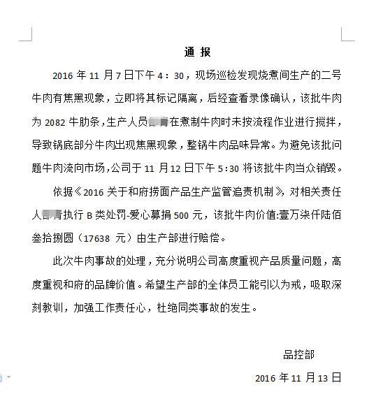 价值17638元,重量达300斤的牛肉,当众焚毁。源于和府捞面品控部在对生产车间正常巡检时发现烧煮间生产的二号牛肉出现瑕疵。