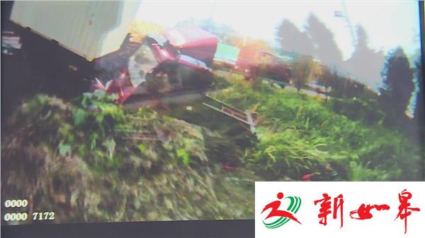 监控显示,20号下午五点左右,在苏同黎公路上,一辆由北往南快速行驶的大货车,在快行驶到姚北路路口时,突然向右,快撞到隔离栏时,又转向左侧,径直撞上了路口等候的一辆三轮车。