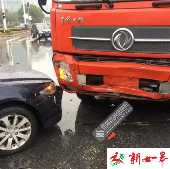 如皋御龙湾附近一卡车与轿车相撞 轿车被撞转了一大圈