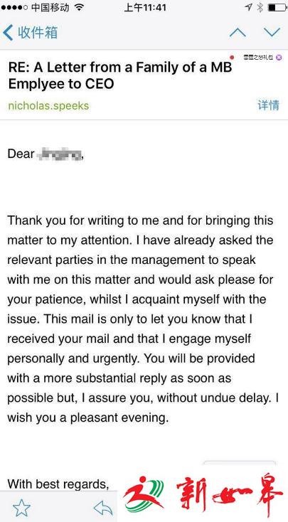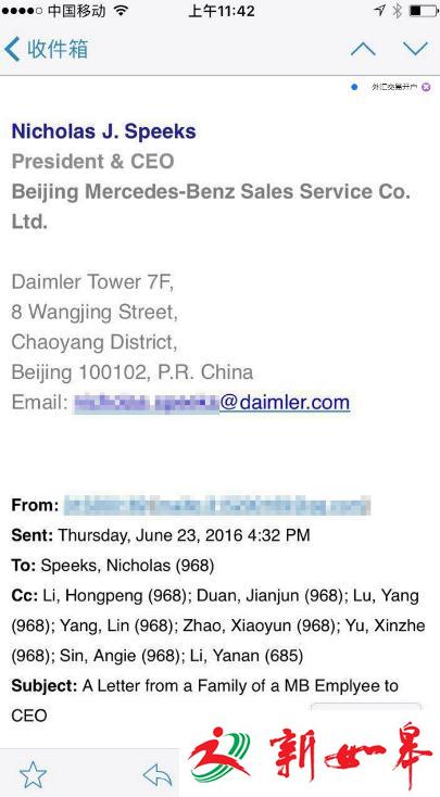 伍媛决定绕过先生的直属领导,向奔驰中国区CEO倪恺发邮件求助,然而总裁虽然给了回复,但公司方面却没有让主事者道歉而是指责伍媛的先生泄密。无奈之下,伍媛随后又发邮件求助全球CEO蔡澈,可惜并未有回应。