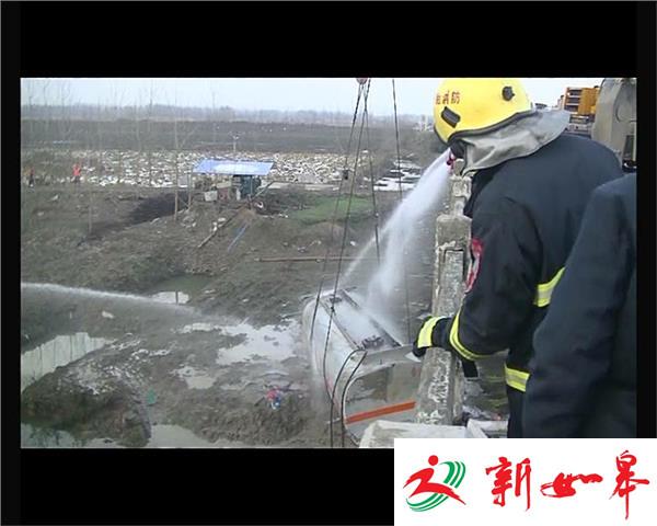 11月24日上午8时50分,119指挥中心再次调动金湖中队2车10人,盱眙中队1车7人及马坝政府专职队赶往现场协助道路施救部门将桥下的发生泄漏的油罐车吊至桥上。因油罐车的特殊性,消防官兵出了三支枪对油罐车进行持续的冲刷,防止起吊过程中发生意外。由于油罐车自重较大,且罐内汽油不停晃动,再加上两辆吊车之间不好配合,给此次行动造成很大困难。24日下午17时30分,掉下桥的油罐车被成功吊至桥上。随后由其所在公司运走。