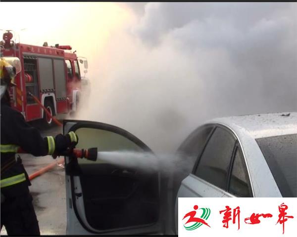 救援人员到达现场后发现,起火的是一辆白色奥迪轿车,轿车发动机前盖内着火,冒出大量黑烟,处于猛烈燃烧状态。