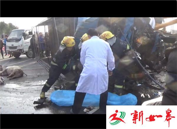 事故现场,拉猪的小货车侧翻在地,车头受损,严重变形。货车内有1人被困,所幸没有生命危险。事故中,车上的20多头猪被甩出车外,多半已经死亡。